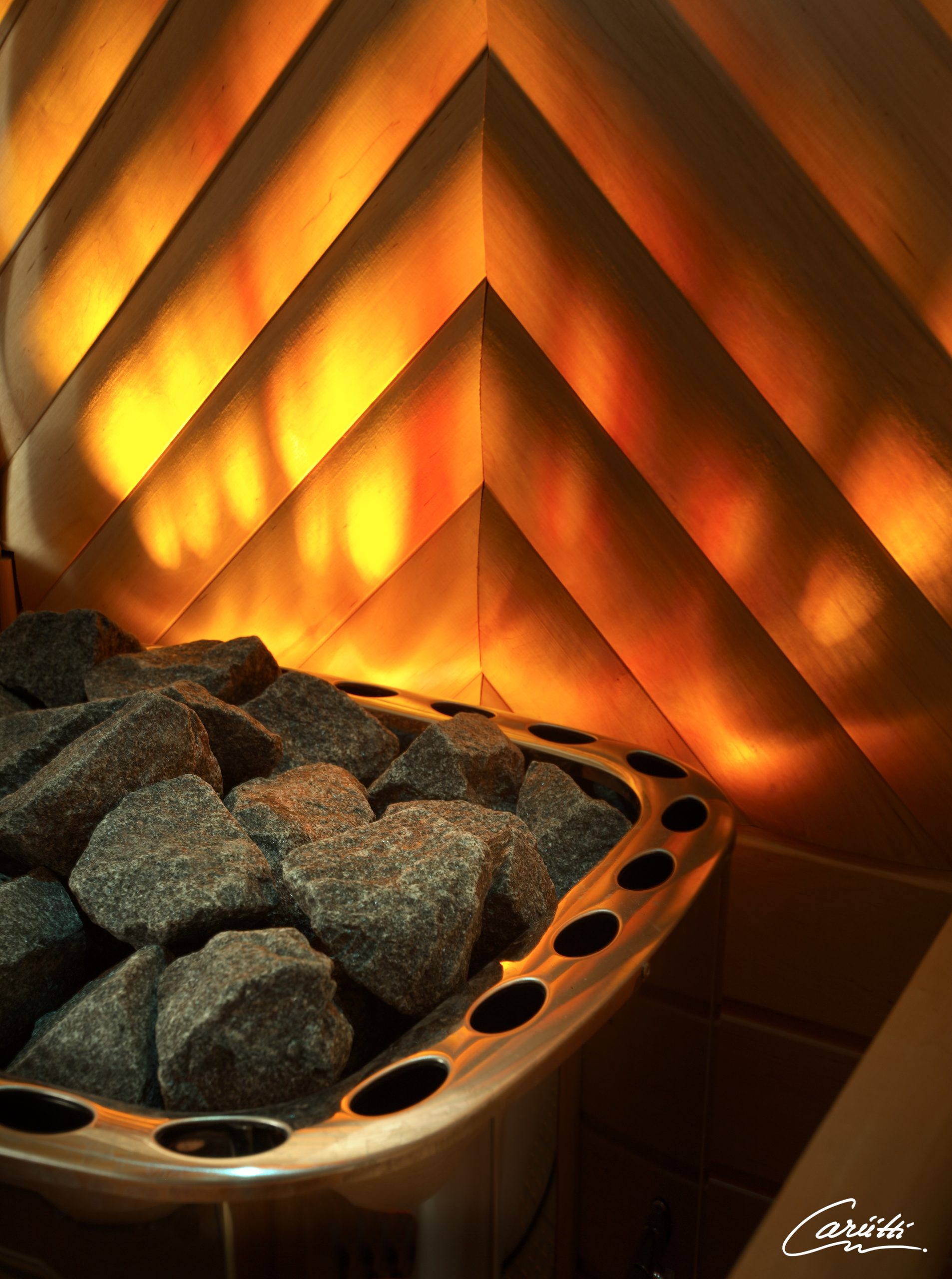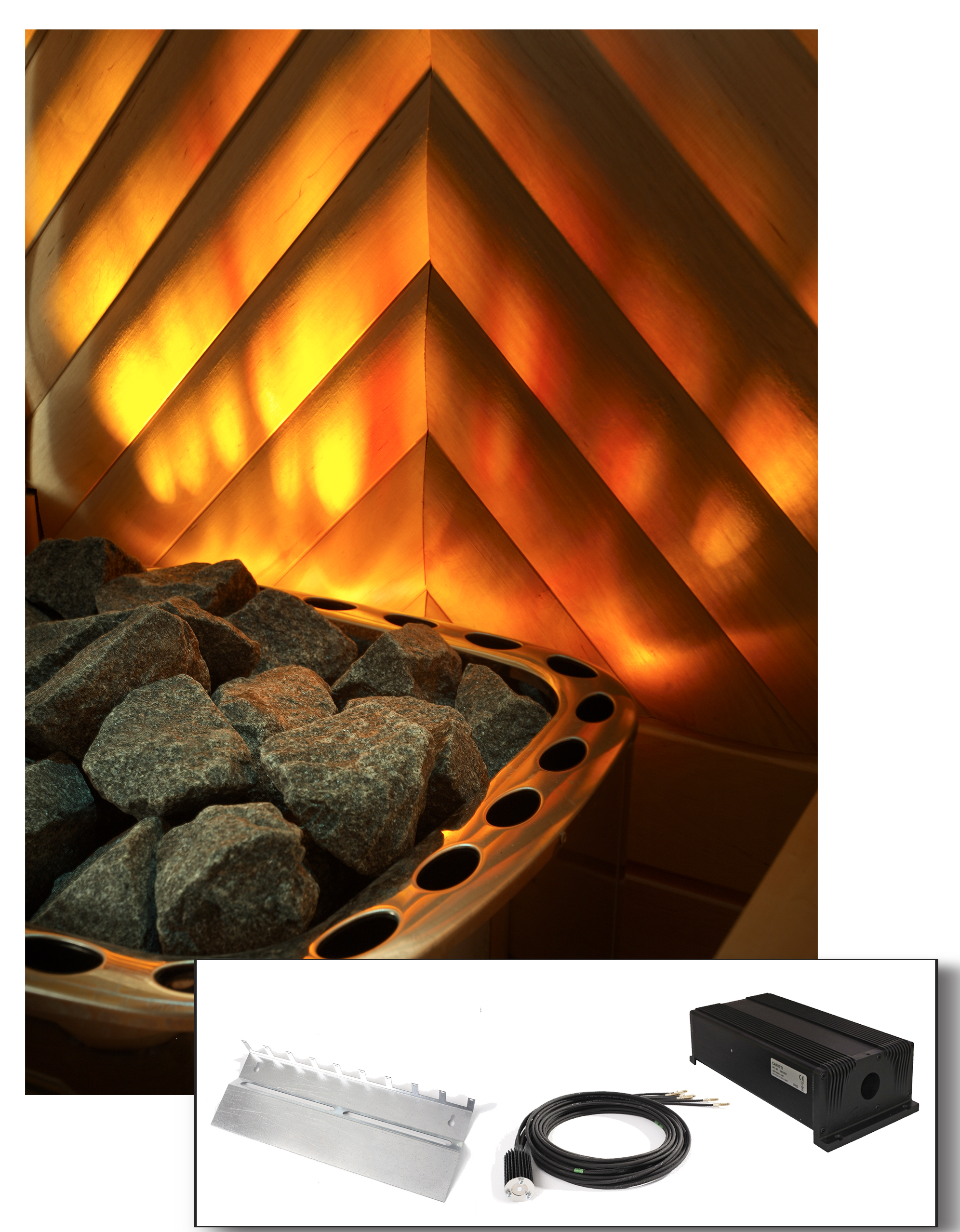 Der Feuerschein-Satz wurde zur Installation in der Sauna hinter dem Ofen entworfen und kann mit den meisten E-Ofen-Modellen verwendet werden. Der Satz umfasst einen VPL30 FL-LED-Projektor mit Feuerschein-Effekt, mit wechselnden Farben Orange, Gelb und Bernstein, die von den LEDs erzeugt werden. Dank Schutzklasse IP65 kann er in einer Sauna unter den Bänken installiert werden.