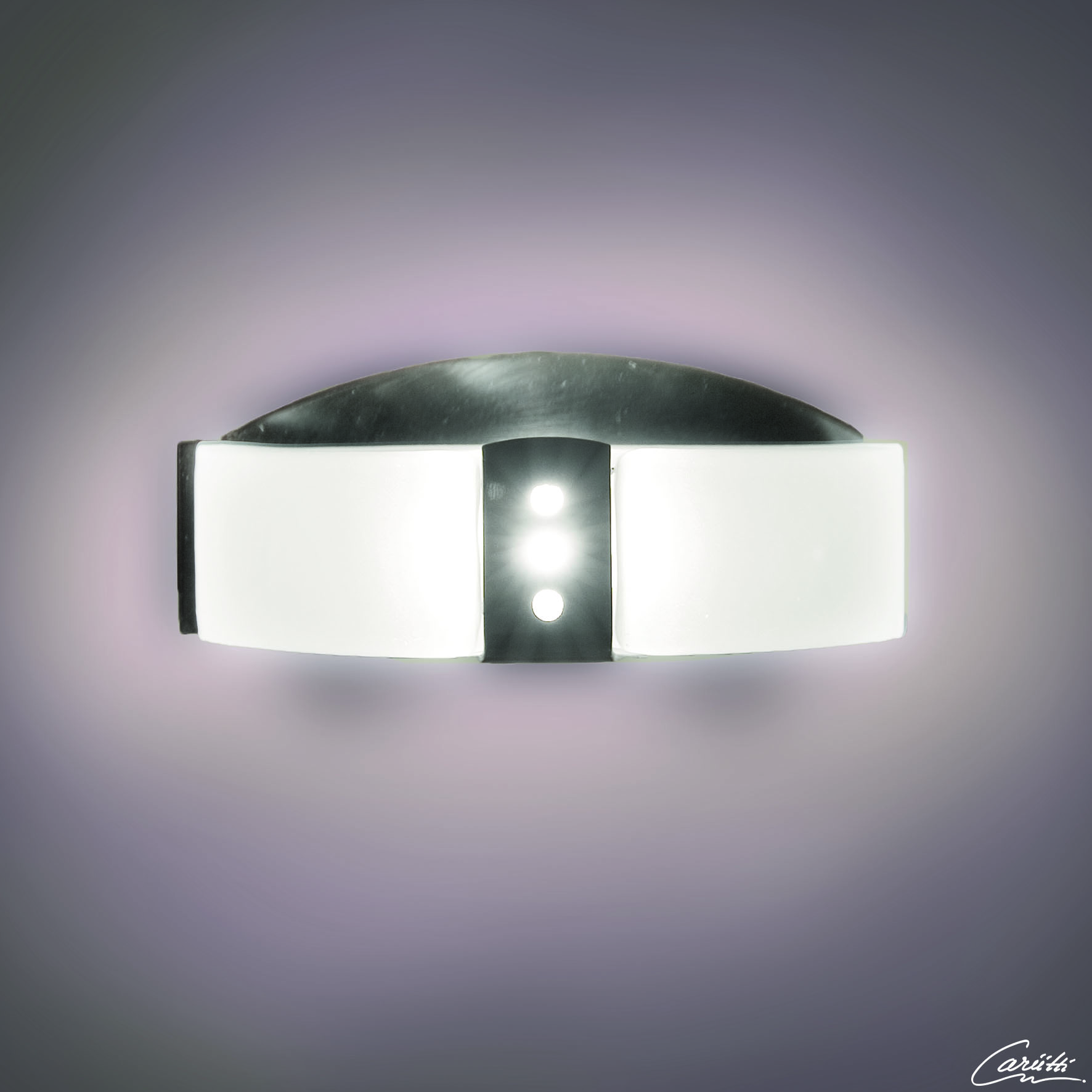 Wandleuchte aus poliertem Edelstahl und Satinglas. Als Leuchtmittel dient eine LED oder eine optische Faser (2-4 mm).