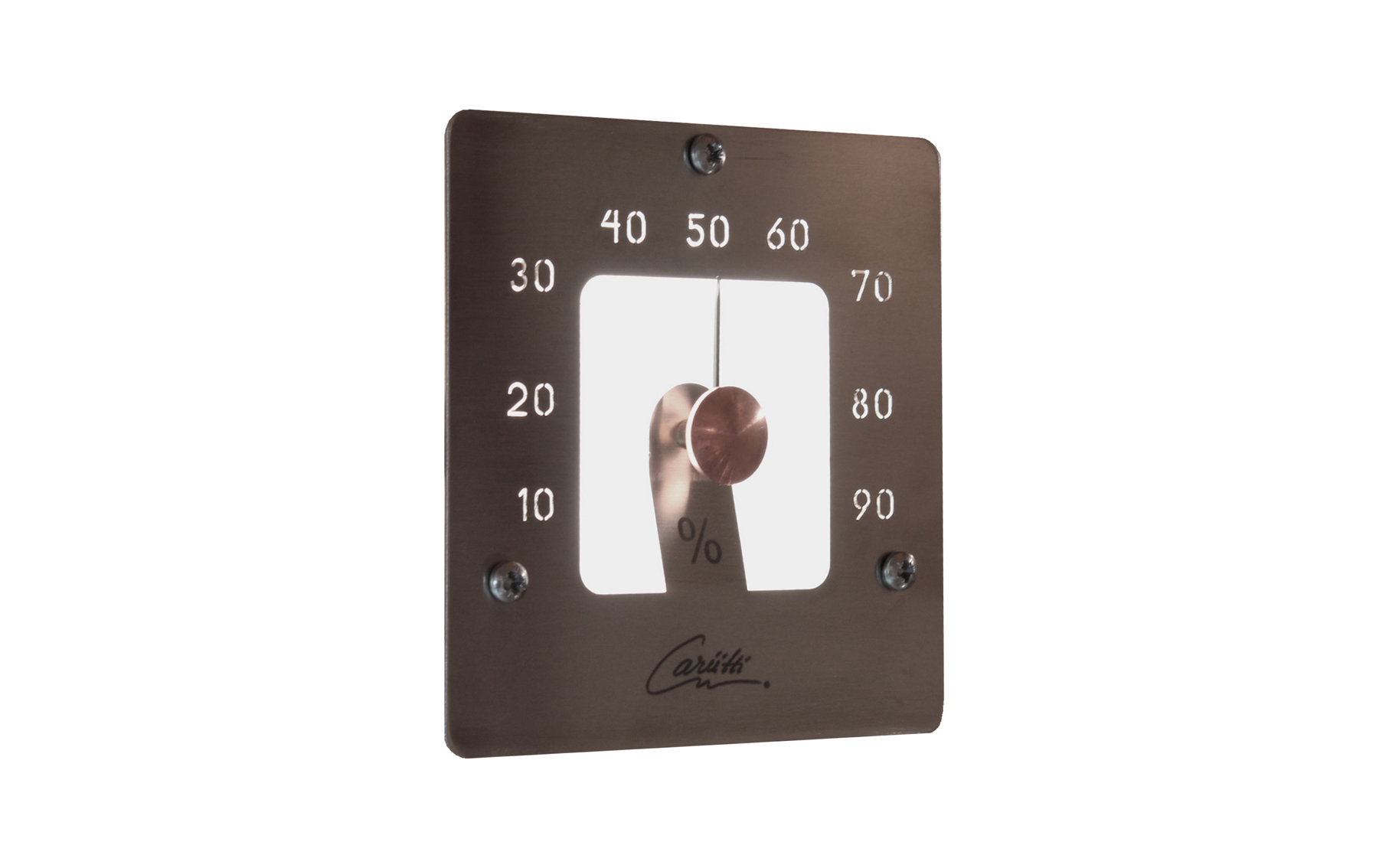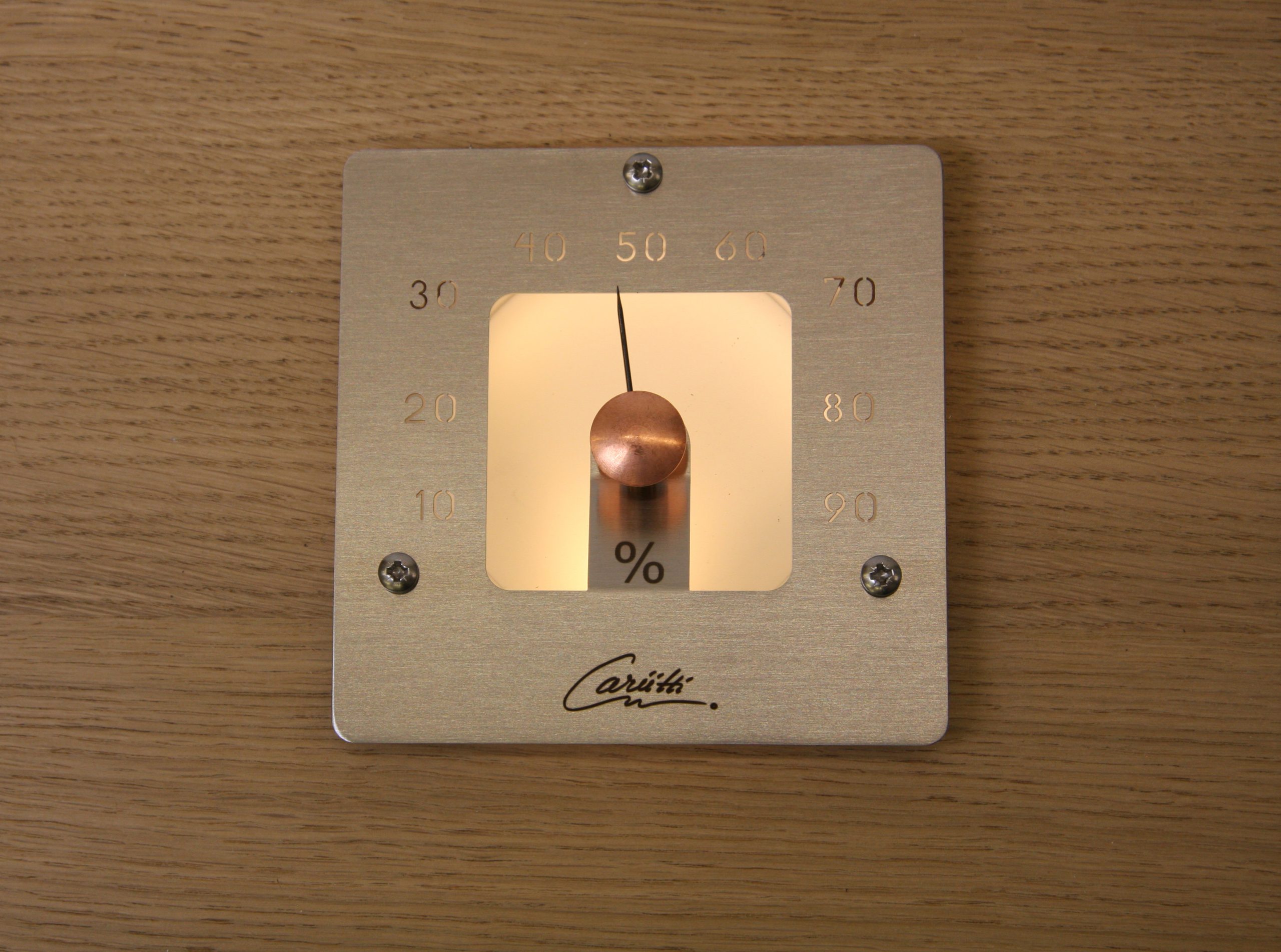 Das Sauna-Hygrometer SQ besteht aus satiniertem Glas und Edelstahl.