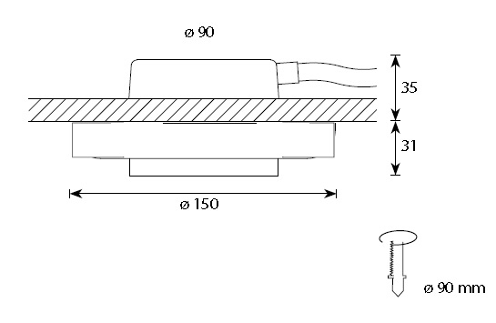 Abmessungen: Außendurchmesser 150 mm, Durchmesser der Installationsbohrung 90 mm, Aussparung 35 mm, Höhe ab Decken-Oberfläche 31 mm.