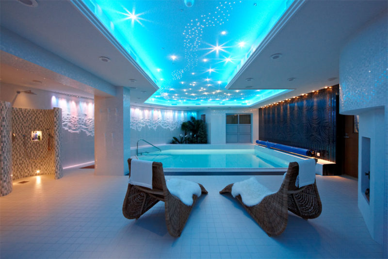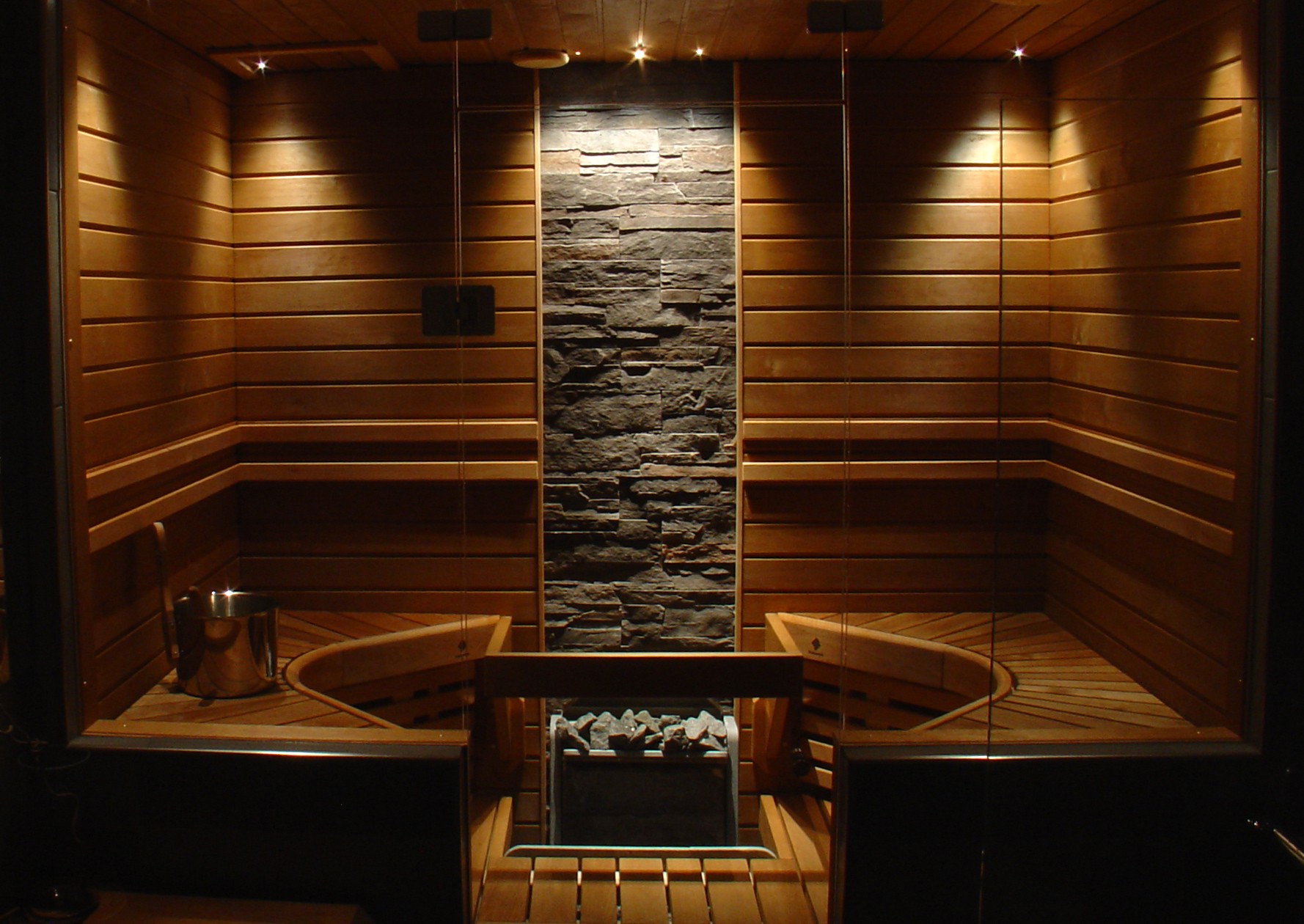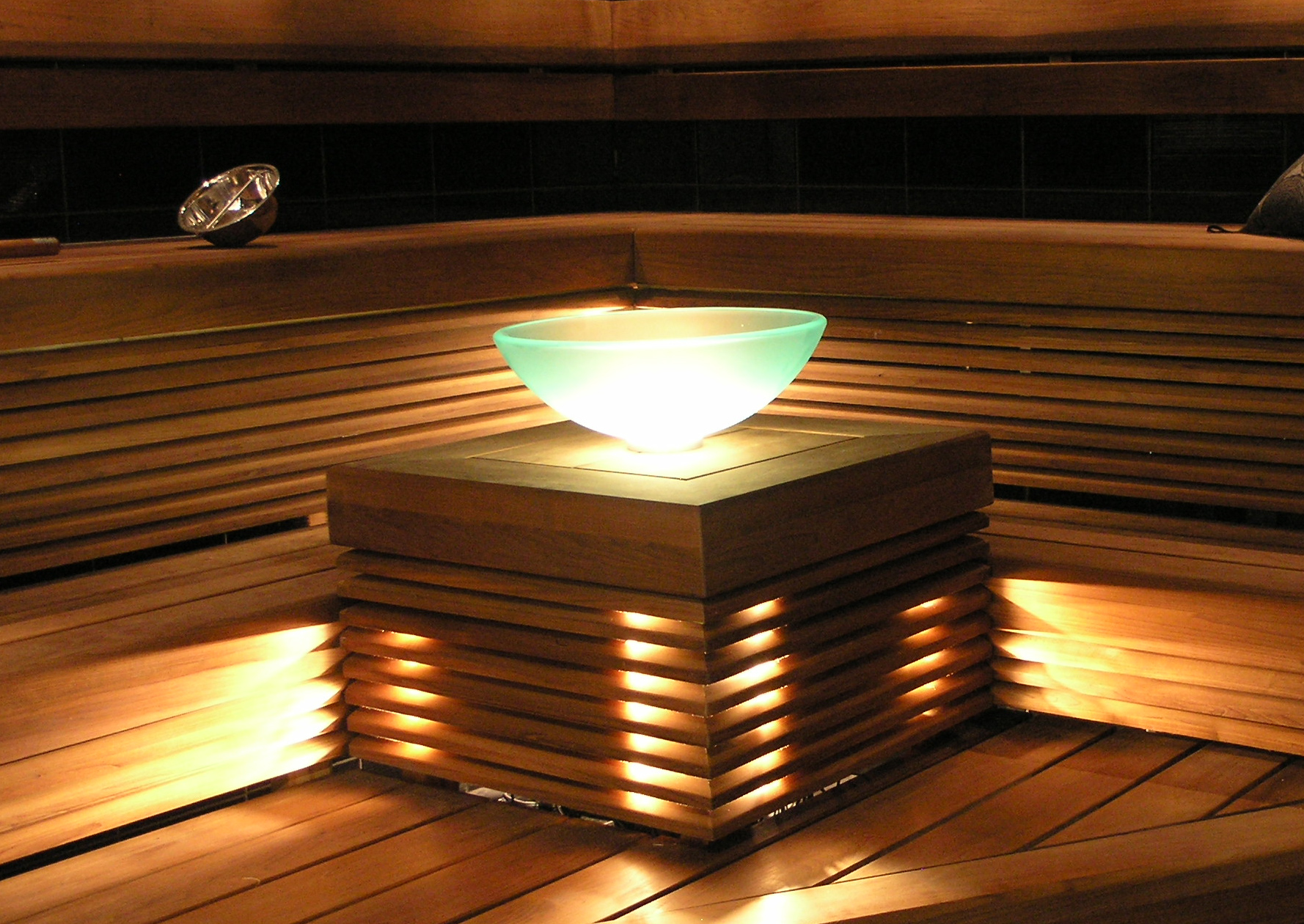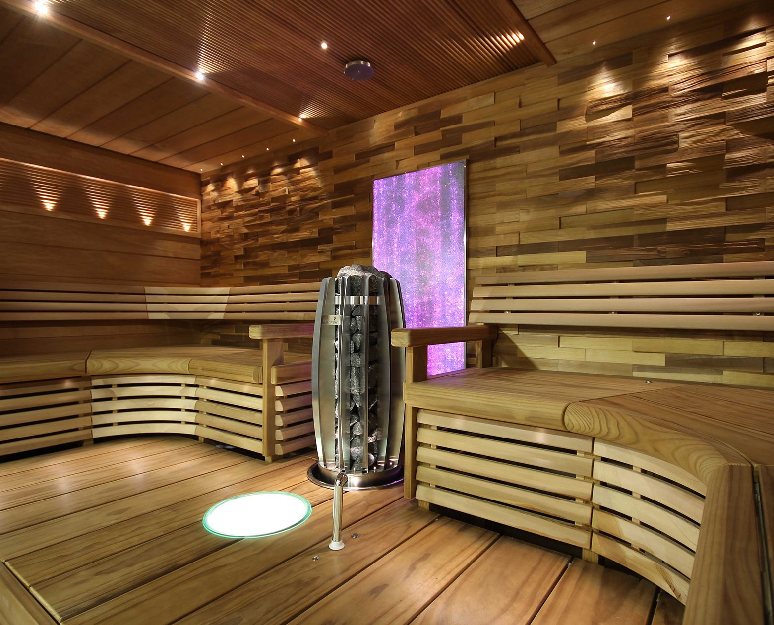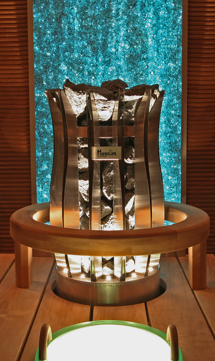 You can complete the sauna lighting with a colour changing crushed glass panel, illuminated water bowls and stove lights.