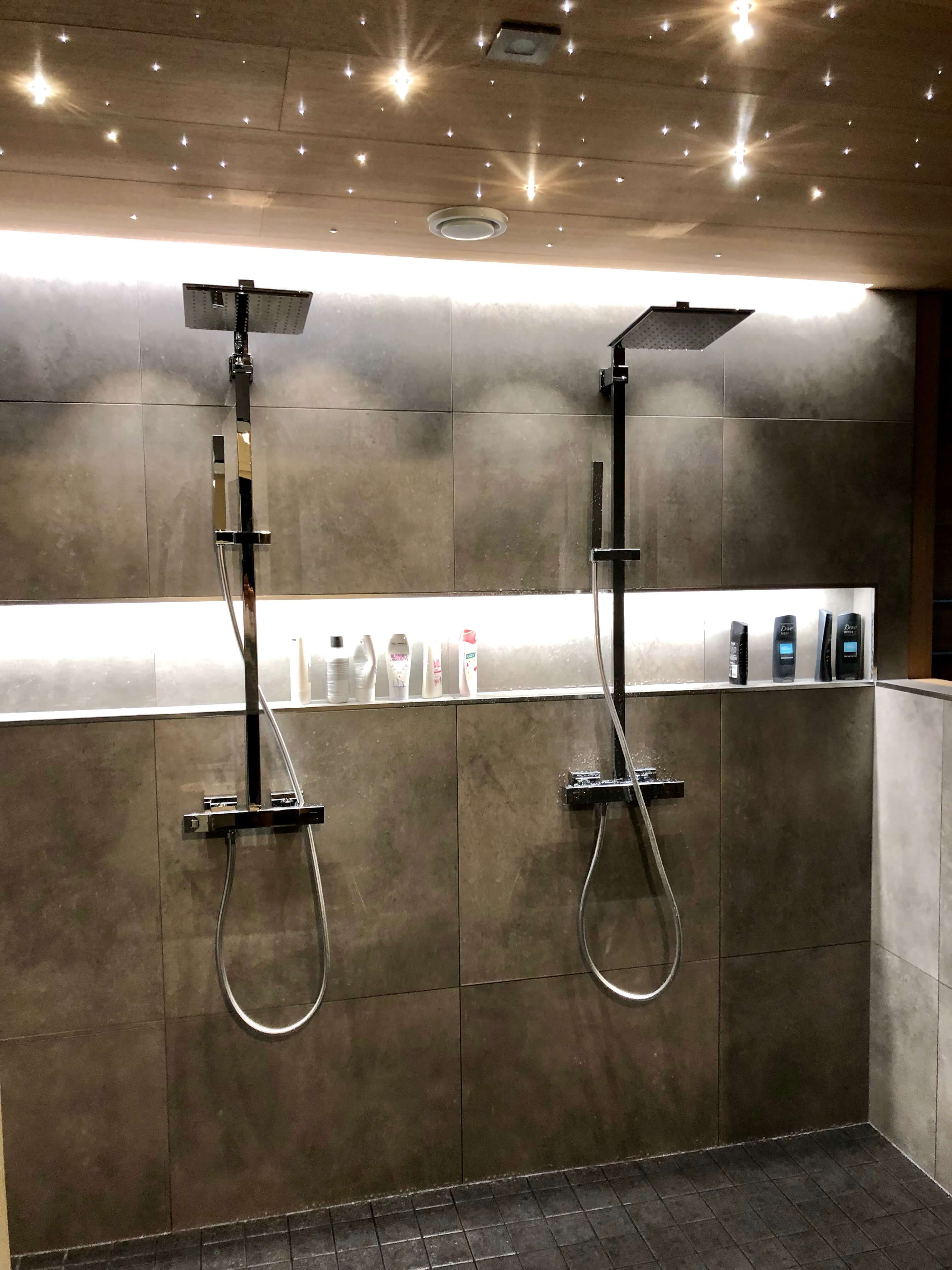 – Auparavant, nous n’avions pas d’emplacement pour les bouteilles de savon et de shampoing. C’est la raison pour laquelle nous avons décidé de faire une étagère encastrée sur toute la surface de la paroi murale de la douche. L’avantage a été d’obtenir en même temps un bon éclairage qui répand une lumière uniforme. Nous voulions aussi donner une petite touche de luxe à notre salle de bains, ainsi nous avons installé un ciel étoilé en cristal, dit Antti.