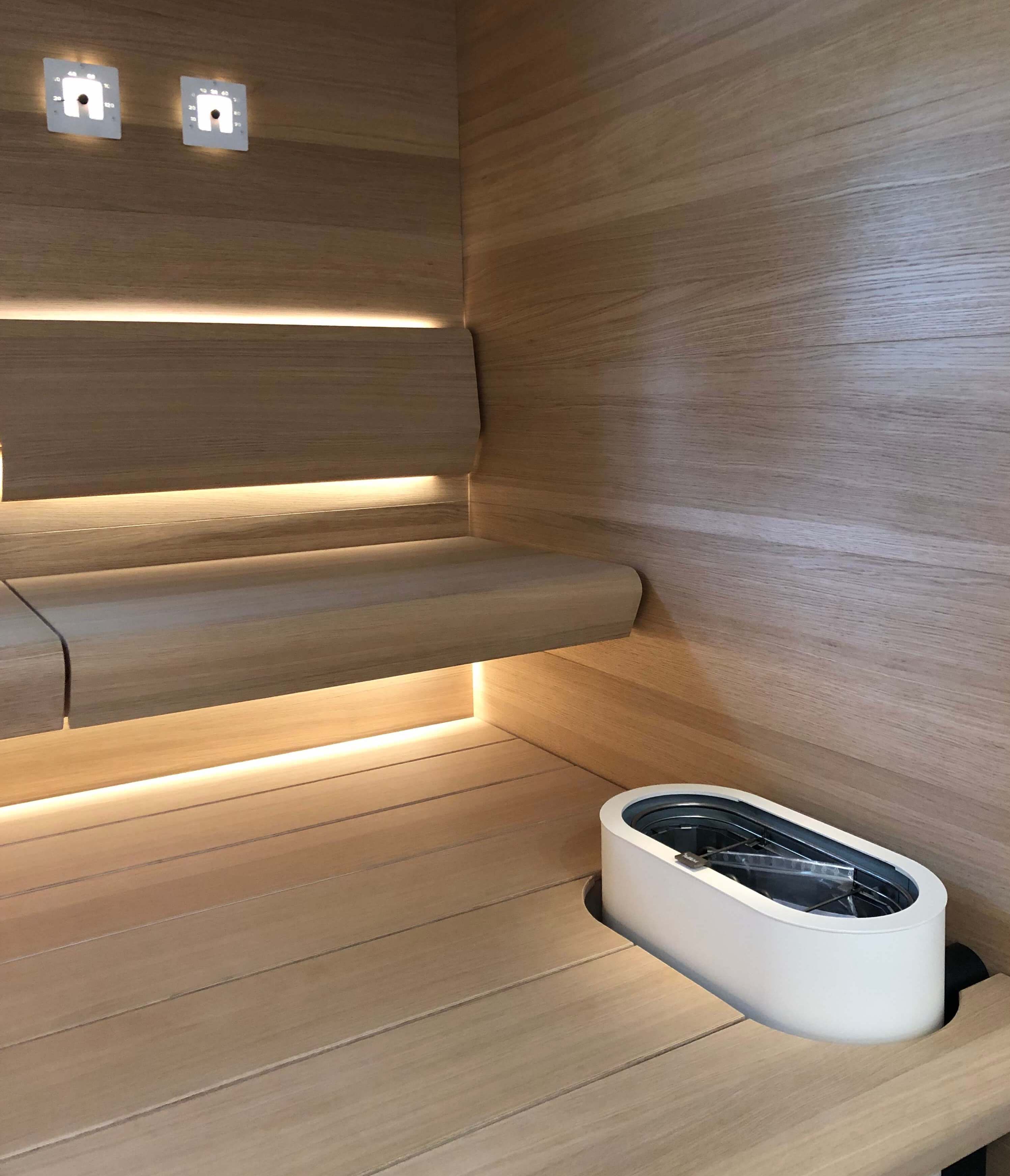 L’éclairage a permis de miser sur la création de la bonne atmosphère. Pour le sauna, on a opté pour l’éclairage Sauna Linear LED de Cariitti qui se marie parfaitement avec les banquettes TAIVE, car il y a des emplacements tout prêts à l’arrière des banquettes.