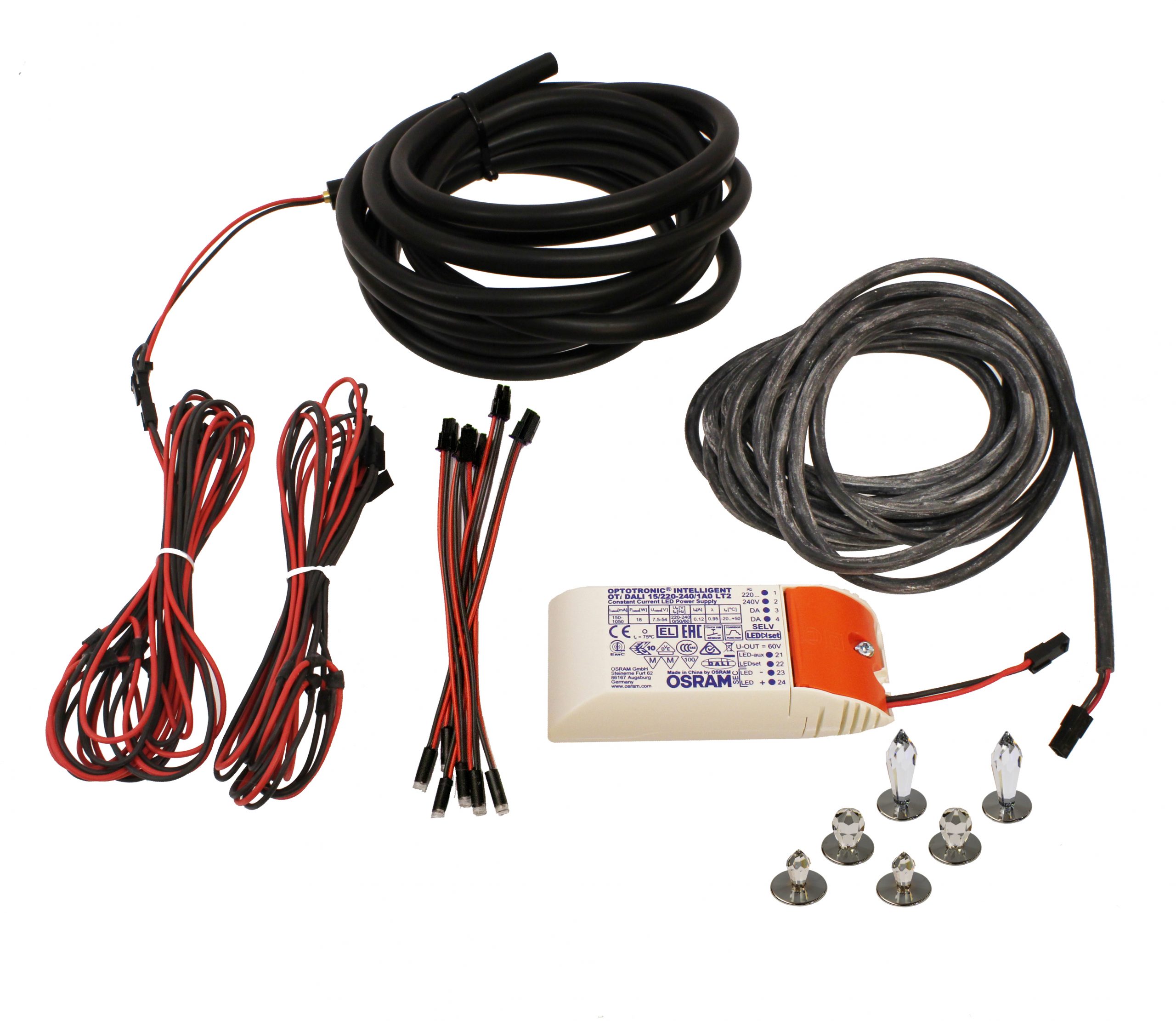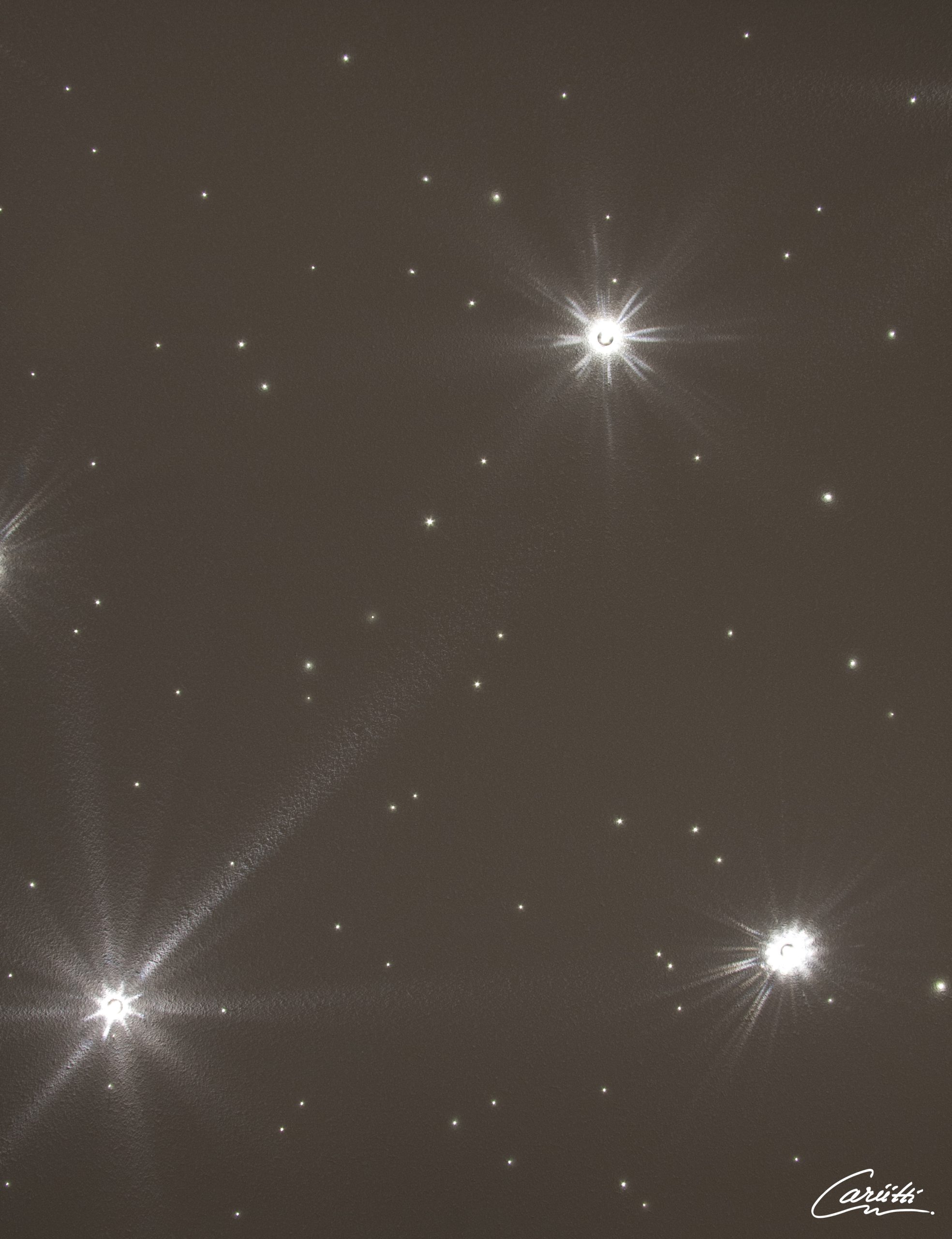 Cette série complète prête à installer comprend un faisceau de fibres optiques plastique (75 fibres), 6 cristaux (2 x CR-12, 2 x CR-16 et 2 x CR-31), 6 LED de 1W (4000K / IP67), ainsi que le bloc d’alimentation. Cette série est bien adaptée pour la réalisation de petits ciels étoilés de 1-2 m2.