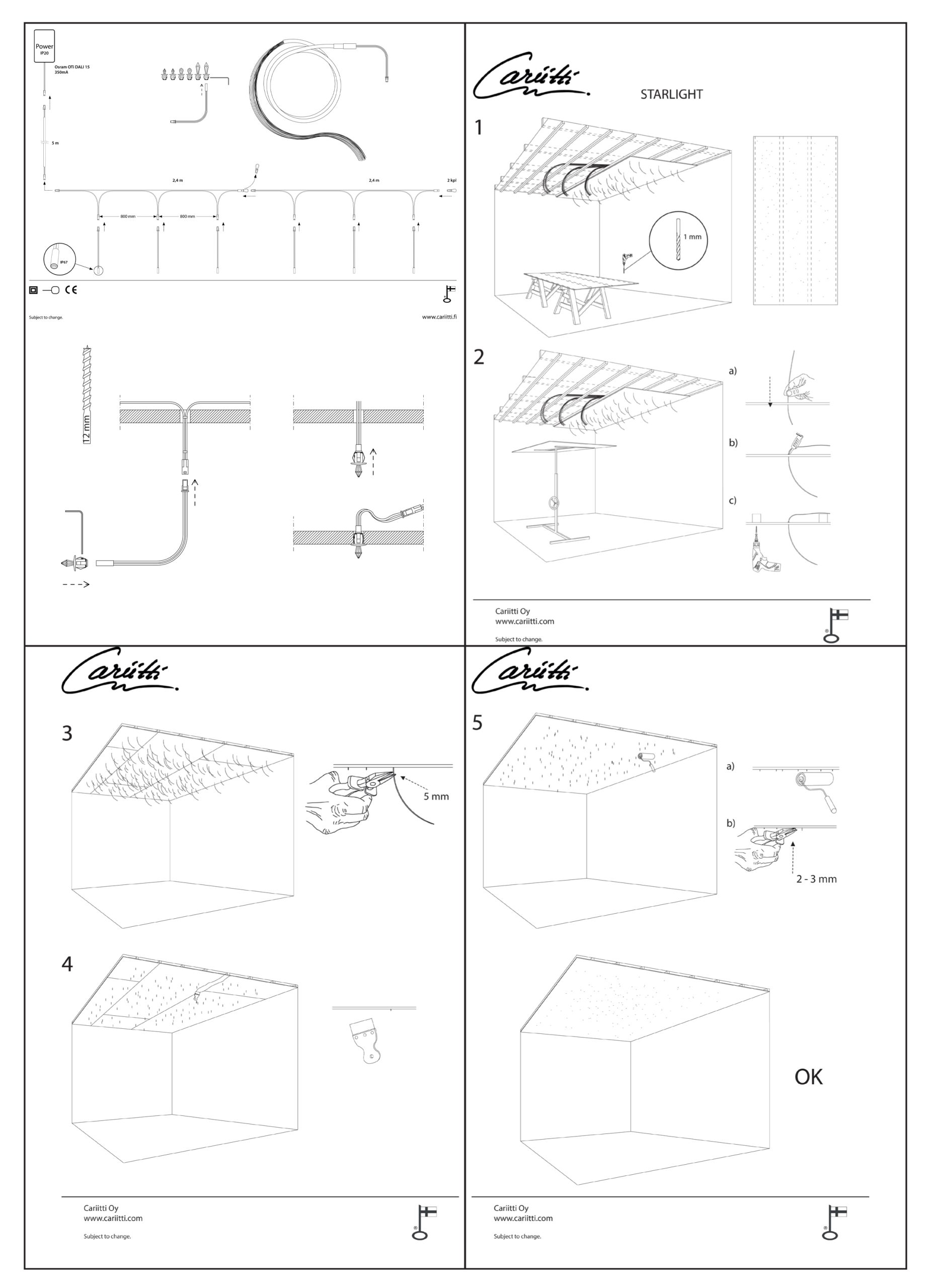 La série inclut 75 fibres optiques de 4 m de longueur. Taille de la fibre ø 0,75 mm.Les fibres de la série sont en plastique et résistent à une chaleur de 80 °C. Les fibres de la série ne doivent pas être installés dans le sauna, mais elles sont adaptées pour les saunas à vapeur et à infrarouge, où la température est inférieure à 80 °C.