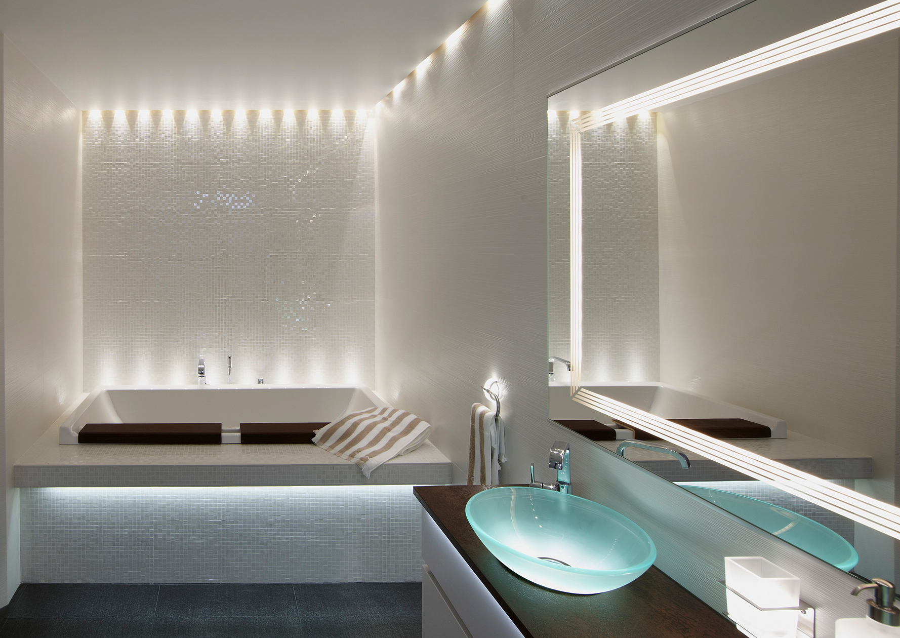 Lasi elää valosta ja niin myös lasimosaiikki. Kun panostat laattoihin muista myös led-valot kylpyhuoneeseen ja niiden korostava vaikutus kauniiseen kokonaisuuteen.