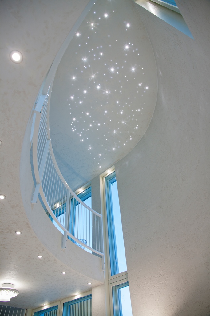 Tähtitaivas valot toteutetaan valokuitutekniikalla, jolla pystytään tekemään todella vaikuttavia valaistuksia. Yhdellä projektorilla voidaan valaista satoja tähtiä. Tähdet voivat olla erikokoisia ja ne saadaan myös tuikkimaan. Voimme myös rakentaa fantasia-tähtitaivaan värien vaihdolla ja tuikkeella. Jo pieni tähtitaivas voi antaa tilalle toivotun tunnelman. Mahdollisuudet ovat rajattomat, voimme vaikka rakentaa oman tähtimerkkimme mukaisen tähtitaivaan ja varustaa isommat tähdet kristallipäätteillä.