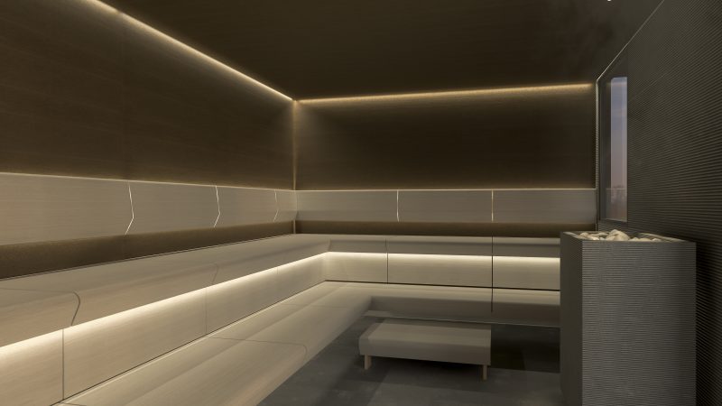 Финские изделия находятся в центре внимания в новом отделении сауны. Вся сауна сделана из коллекции изделий TAIVE. Освещение как для сауны, так и для паровой бани, также от Cariitti, а каменка – от Tulikivi.