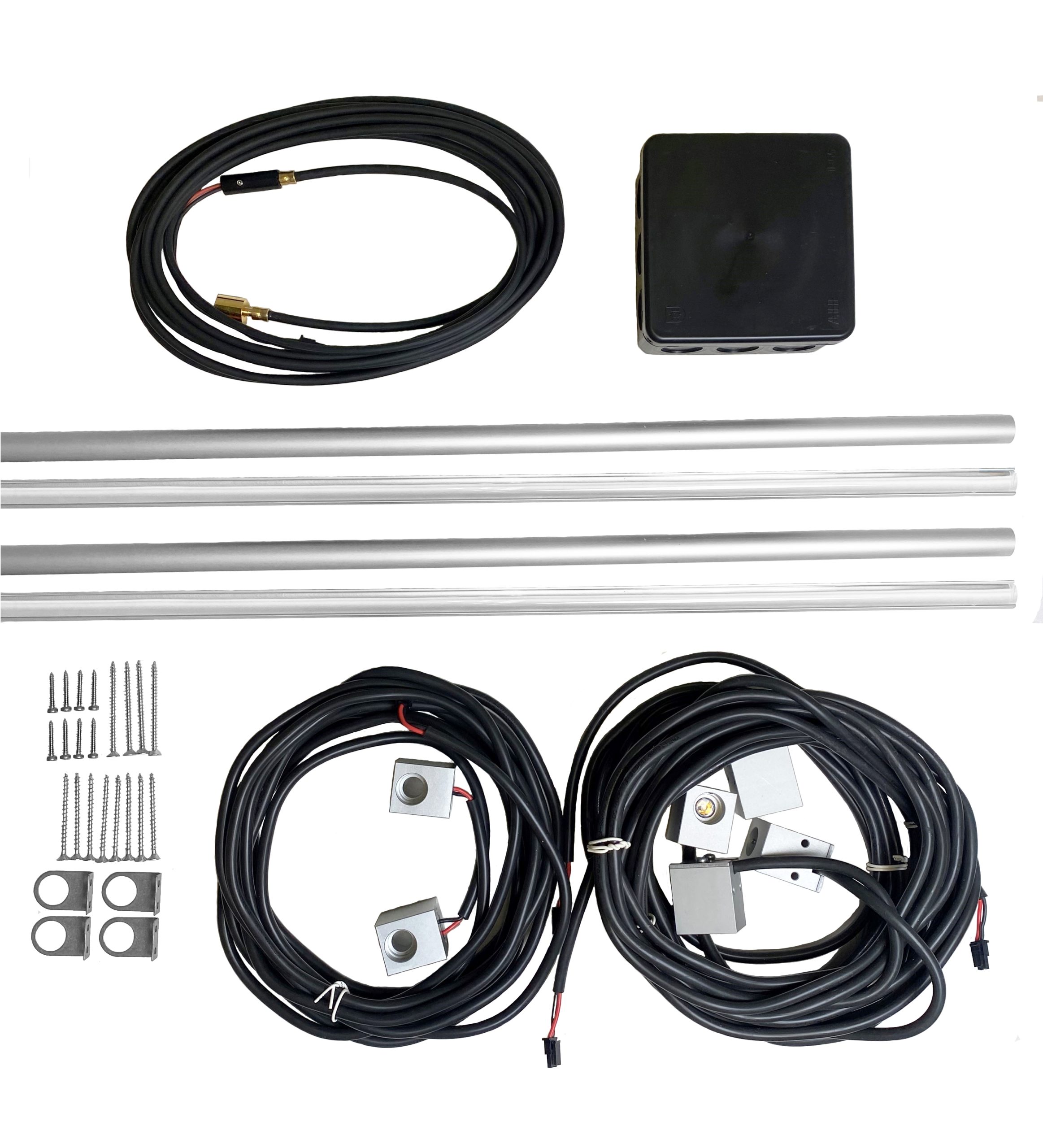 - 6 kpl led-valonlähteitä, neljä tankojen päihin ja kaksi tankojen väliin. Johtojen pituus 2,5 m.